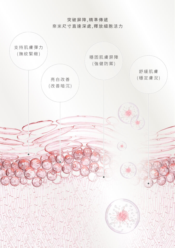 促進膠原更新、細紋撫平與彈性回彈;搭配高分子玻尿酸與納豆膠形成保水網膜,強化肌膚屏障,使水分長效停留。